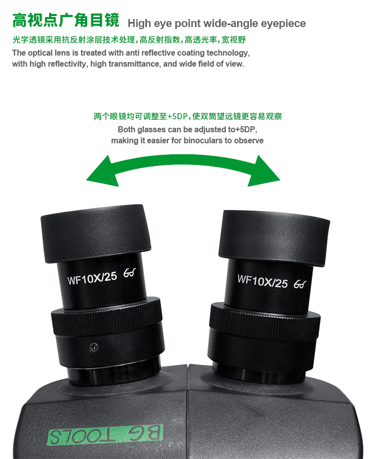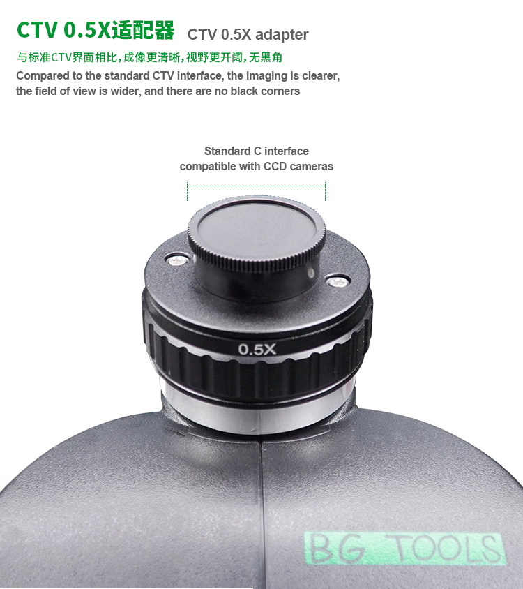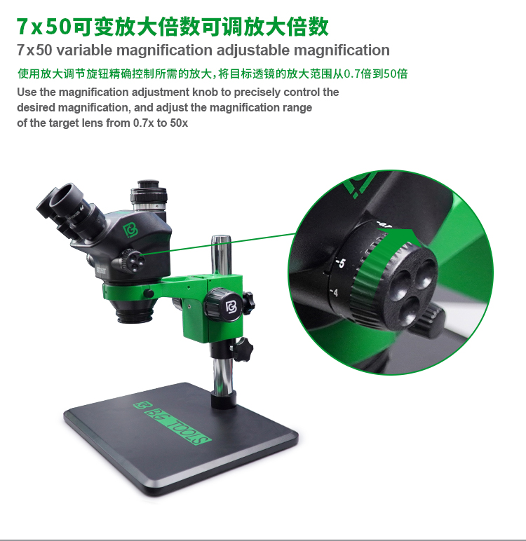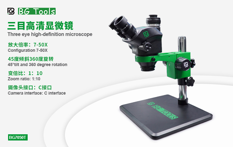 The BG Trinocular Stereo Microscope is designed for precision and versatility in observation. With a standard configuration magnification range of 7X to 50X, this microscope is ideal for a variety of applications, including biological research, electronics, and material inspections. Featuring a WF10X25 eyepiece, users can enjoy a comfortable and spacious field of view. The optional auxiliary objective lenses (0.3X, 0.5X, 0.7X, 1X, 1.5X, 2X) allow for customizable magnification settings to meet specific requirements. This microscope also boasts a magnification ratio of 1:10, facilitating detailed examination of specimens. Additionally, the included adjustable LED dustproof ring light source provides ample illumination, enhancing visibility while preventing debris accumulation.