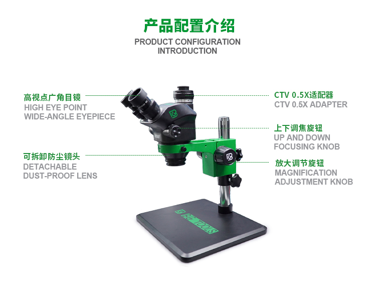 Standard configuration 7-45XEyepiece: standard WF10X25Auxiliary objective lens: 0.3X/0.5X/0.7X/1X/1.5X/2X optionalMagnification ratio: 1:10..