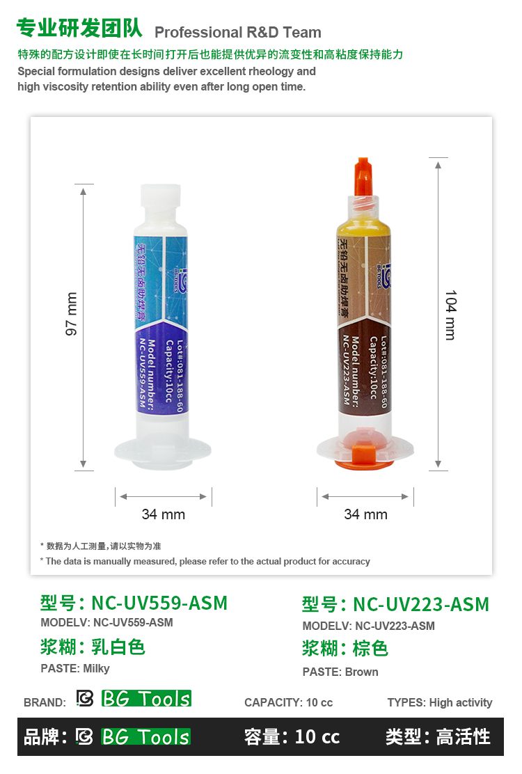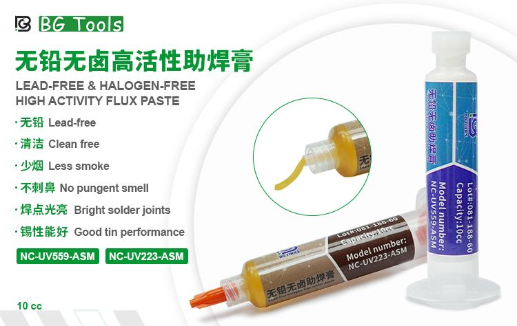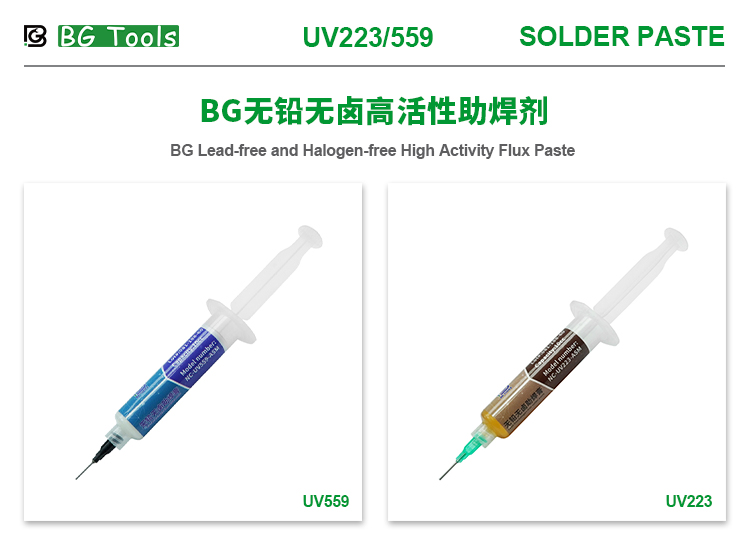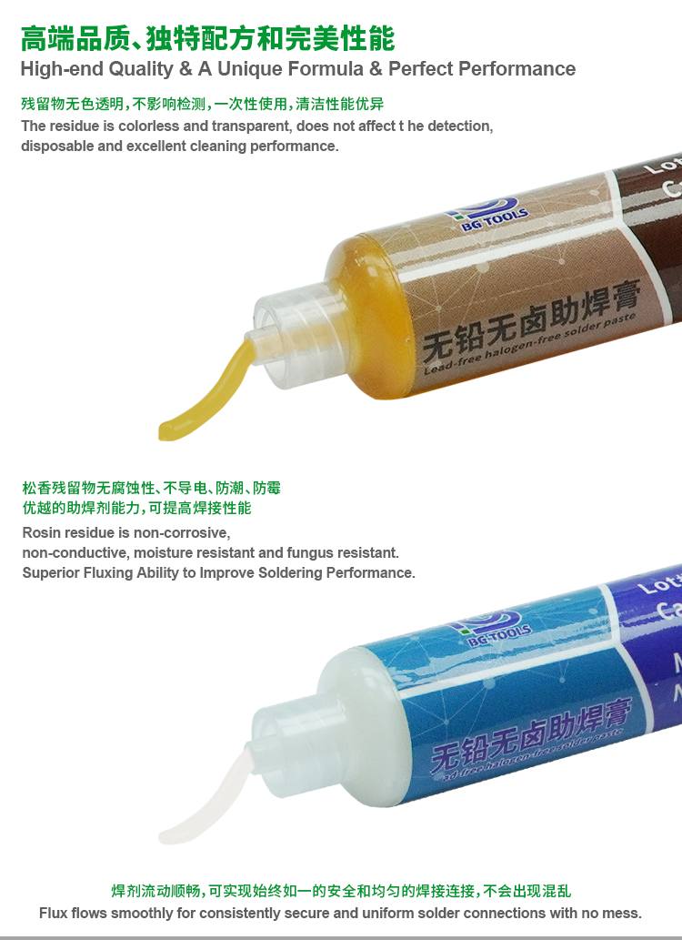 The BG Lead-free and Halogen-free High Activity Flux Paste is an environmentally friendly and high-performance product designed for soldering applications. Being lead-free and halogen-free, it meets strict environmental standards, making it a safe choice for both users and the environment. This flux paste offers clean-free operation, eliminating the need for extensive post-soldering cleaning processes. It demonstrates excellent tin performance, enabling smooth and efficient soldering. When used, it results in bright solder joints, indicating a high-quality connection. Additionally, it produces less smoke during the soldering process, and there is no pungent smell, creating a more pleasant working environment. Whether for professional electronics manufacturing or DIY repair projects, this flux paste is a reliable option that combines environmental friendliness with outstanding soldering performance.