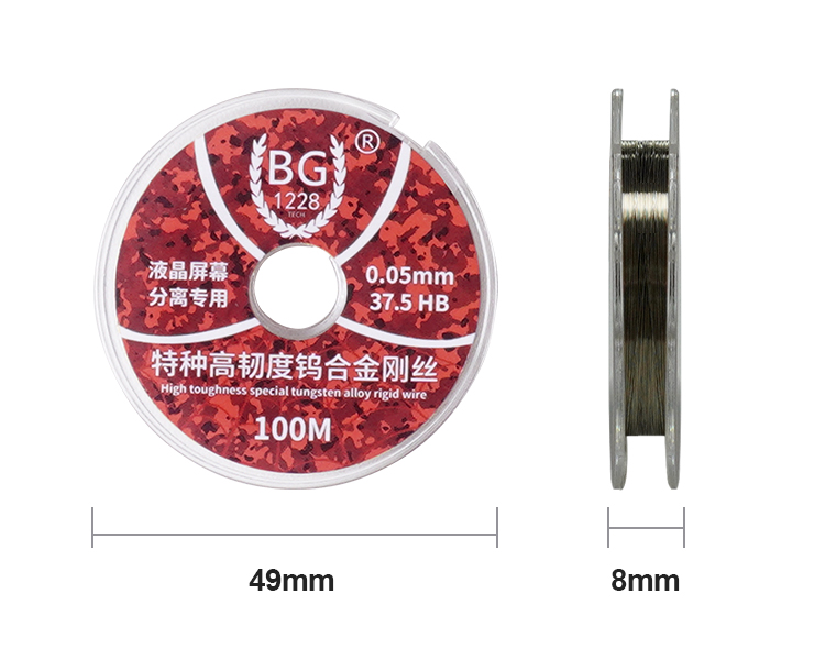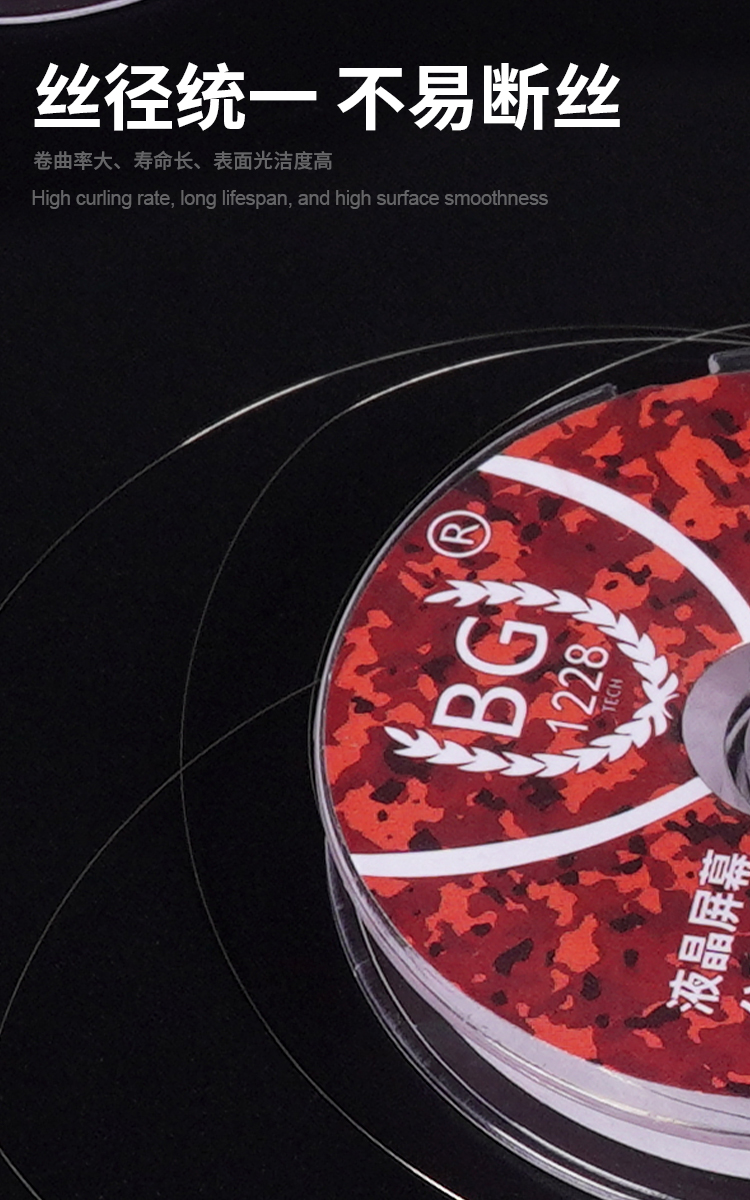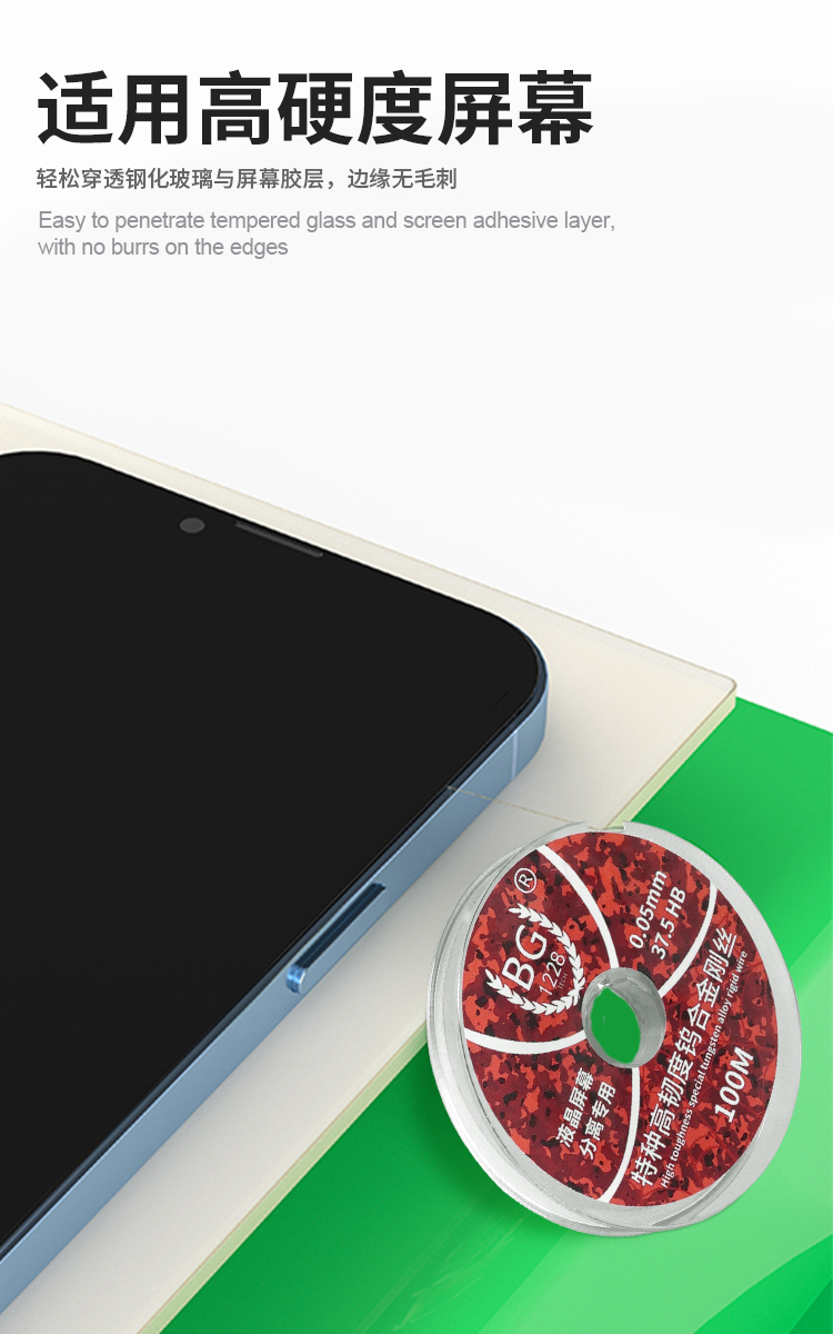 BG The Special Cutting Wire for Mobile Glass is expertly engineered for precision cutting with a hardness rating of 37.5HB. This specialized wire is available in various sizes, including 0.03mm, 0.04mm, 0.05mm, 0.06mm, 0.08mm, and 0.10mm, making it suitable for diverse mobile glass applications. Its exceptional durability and flexibility ensure clean cuts and minimize damage, essential for high-quality glass processing in mobile devices.